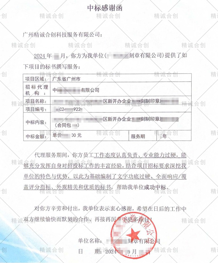 感谢客户选择我司标书编制服务,我们将以诚信负责的态度和高效专业的作风,继续协助客户中标!